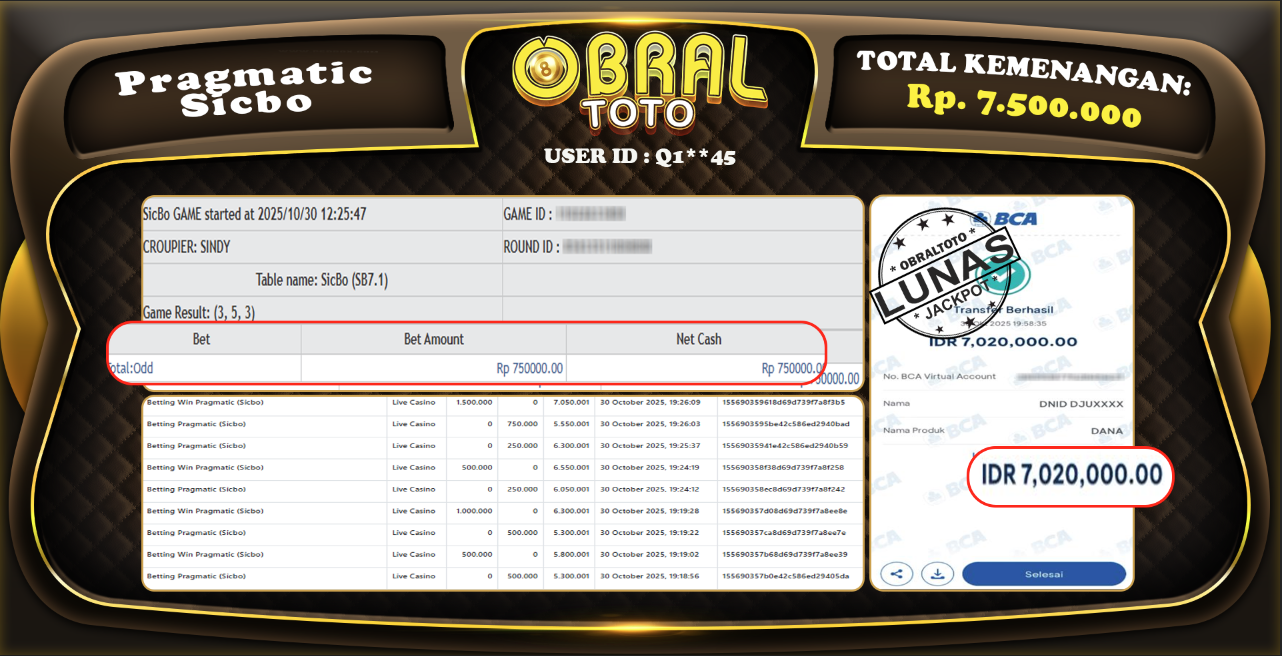 Kami merayakan selamat kepada salah satu pemain setia situs OBRALTOTO yang berhasil meraih kemenangan besar senilai Rp,7.500.000 dalam permainan PRAGMATIC SICBO pada tanggal 31 Oktober 2025. Kemenangan ini telah kami proses dan pemahaman secara LUNAS ke rekening yang terdaftar. Semoga kemenangan ini menjadi motivasi bagi pemain lainnya untuk terus mencoba keberuntungan dan menikmati permainan di OBRALTOTO .