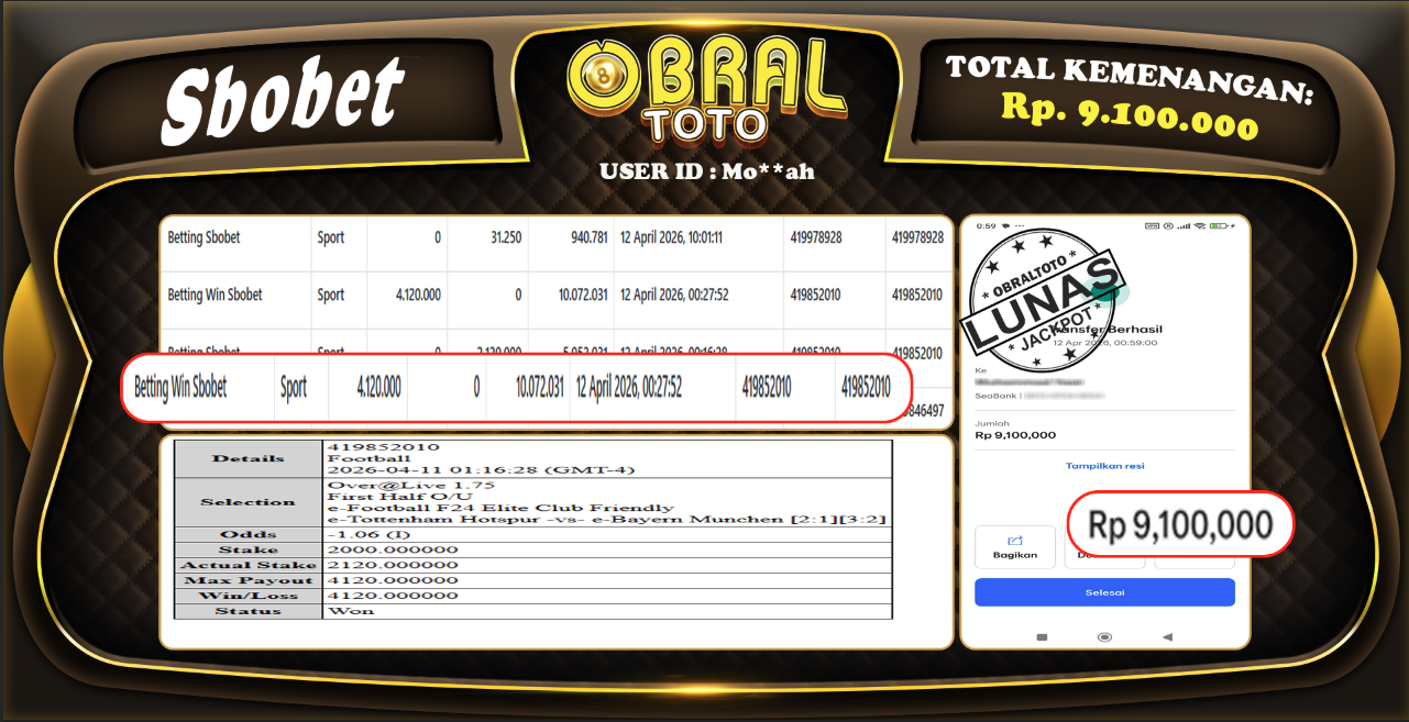 OBRALTOTO – Selamat Kepada Pemenang User id : Mo**ah SBOBET, Rp.9.100.000,- 13 ARPIL 2026 – Situs game online terpercaya dengan bukti jp yang telah resmi dan terjamin di Indonesia, memberikan pengalaman bermain yang aman dan menyenangkan bagi para penggemar game online. Dengan hadirnya OBRALTOTO , pemain dapat menikmati kemudahan akses ke berbagai permainan seru, peluang memenangkan hadiah besar, serta keuntungan menarik yang telah disiapkan khusus untuk para member lama maupun member baru. Platform ini dirancang untuk memberikan kenyamanan dan keamanan, sehingga setiap pemain dapat fokus menikmati permainan sekaligus meraih keuntungan maksimal.