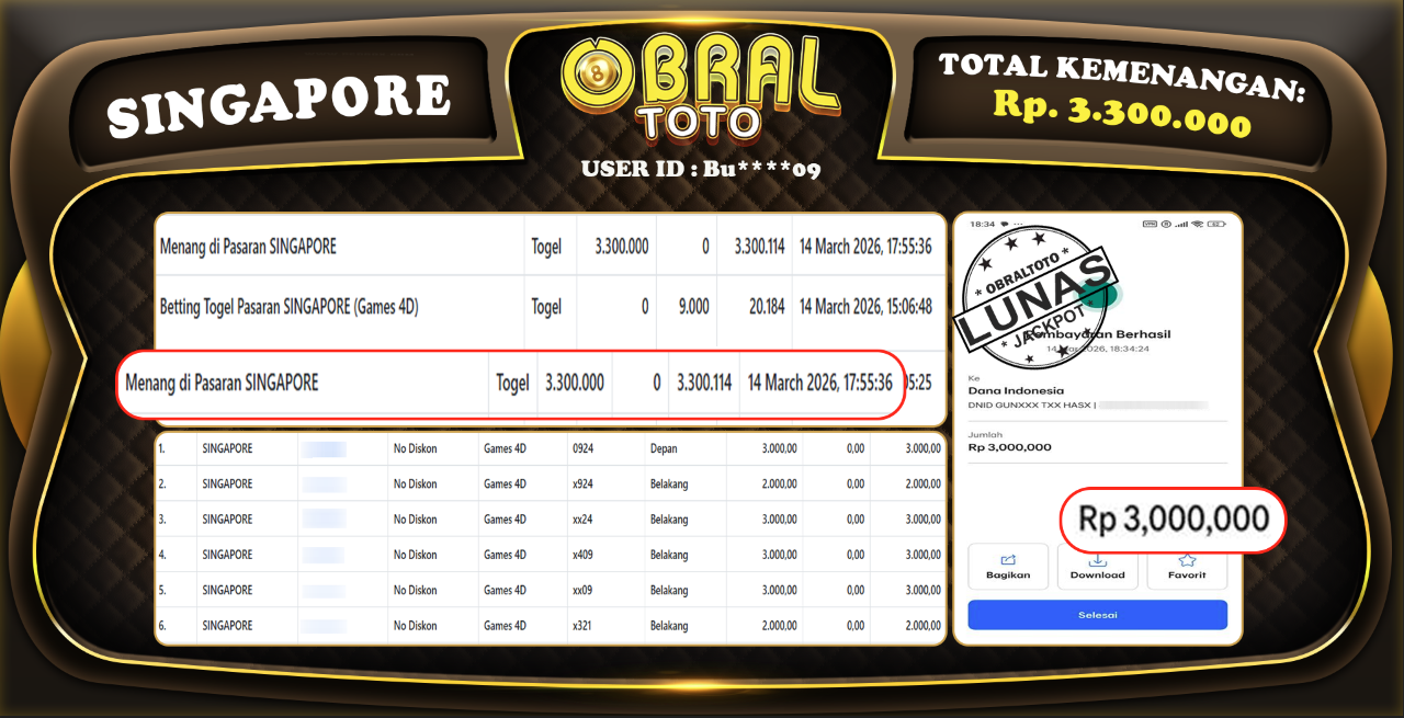 Kami merayakan selamat kepada salah satu pemain setia situs OBRALTOTO yang berhasil meraih kemenangan besar senilai Rp 3,300,000 dalam permainan SINGAPORE pada tanggal 15 MARET 2026. Kemenangan ini telah kami proses dan pemahaman secara LUNAS ke rekening yang terdaftar. Semoga kemenangan ini menjadi motivasi bagi pemain lainnya untuk terus mencoba keberuntungan dan menikmati permainan di OBRALTOTO .
