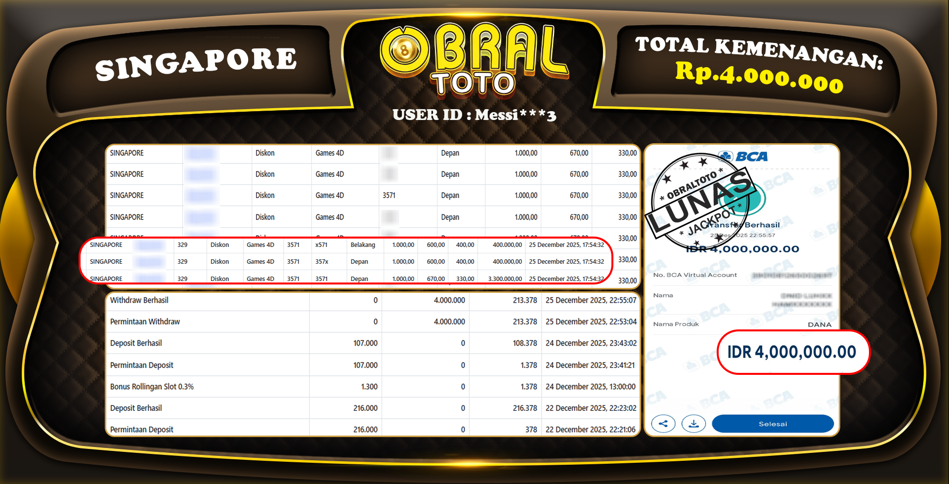 Kami merayakan selamat kepada salah satu pemain setia situs OBRALTOTO yang berhasil meraih kemenangan besar senilai Rp,4.000.000 dalam permainan SINGAPORE pada tanggal 26 DESEMBER 2025. Kemenangan ini telah kami proses dan pemahaman secara LUNAS ke rekening yang terdaftar. Semoga kemenangan ini menjadi motivasi bagi pemain lainnya untuk terus mencoba keberuntungan dan menikmati permainan di OBRALTOTO .