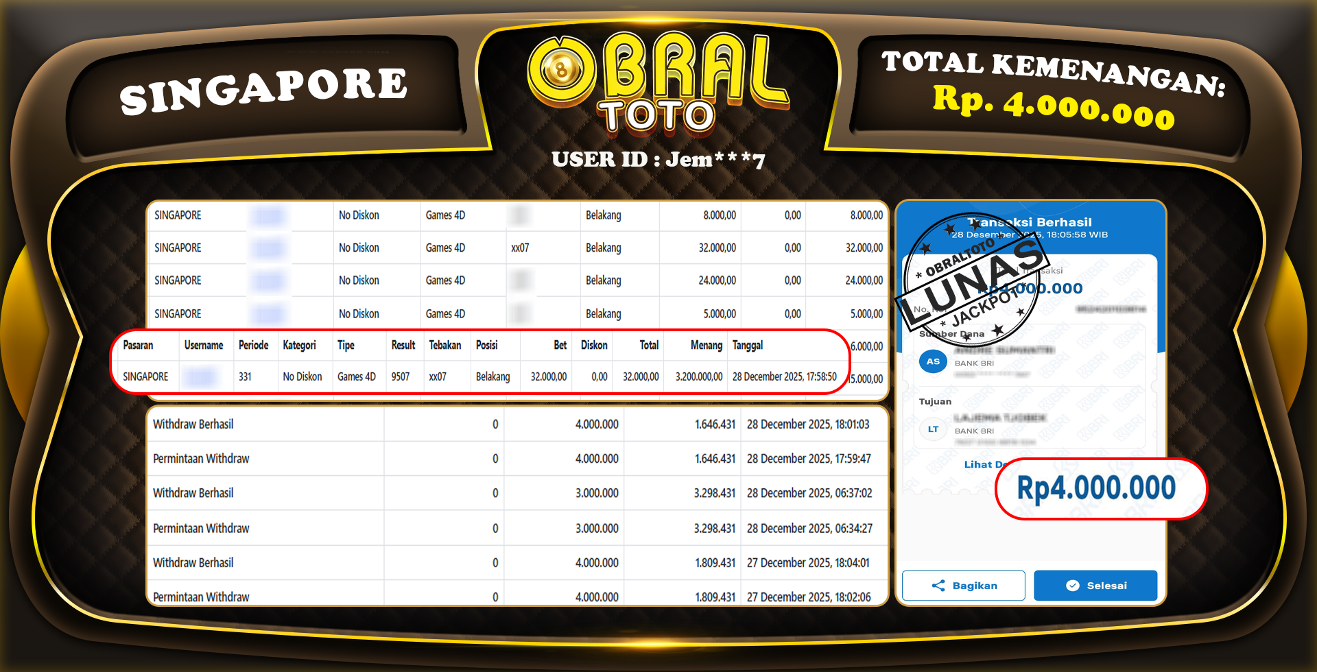 Kami merayakan selamat kepada salah satu pemain setia situs OBRALTOTO yang berhasil meraih kemenangan besar senilai Rp,4.000.000 dalam permainan SINGAPORE pada tanggal 29 DESEMBER 2025. Kemenangan ini telah kami proses dan pemahaman secara LUNAS ke rekening yang terdaftar. Semoga kemenangan ini menjadi motivasi bagi pemain lainnya untuk terus mencoba keberuntungan dan menikmati permainan di OBRALTOTO .