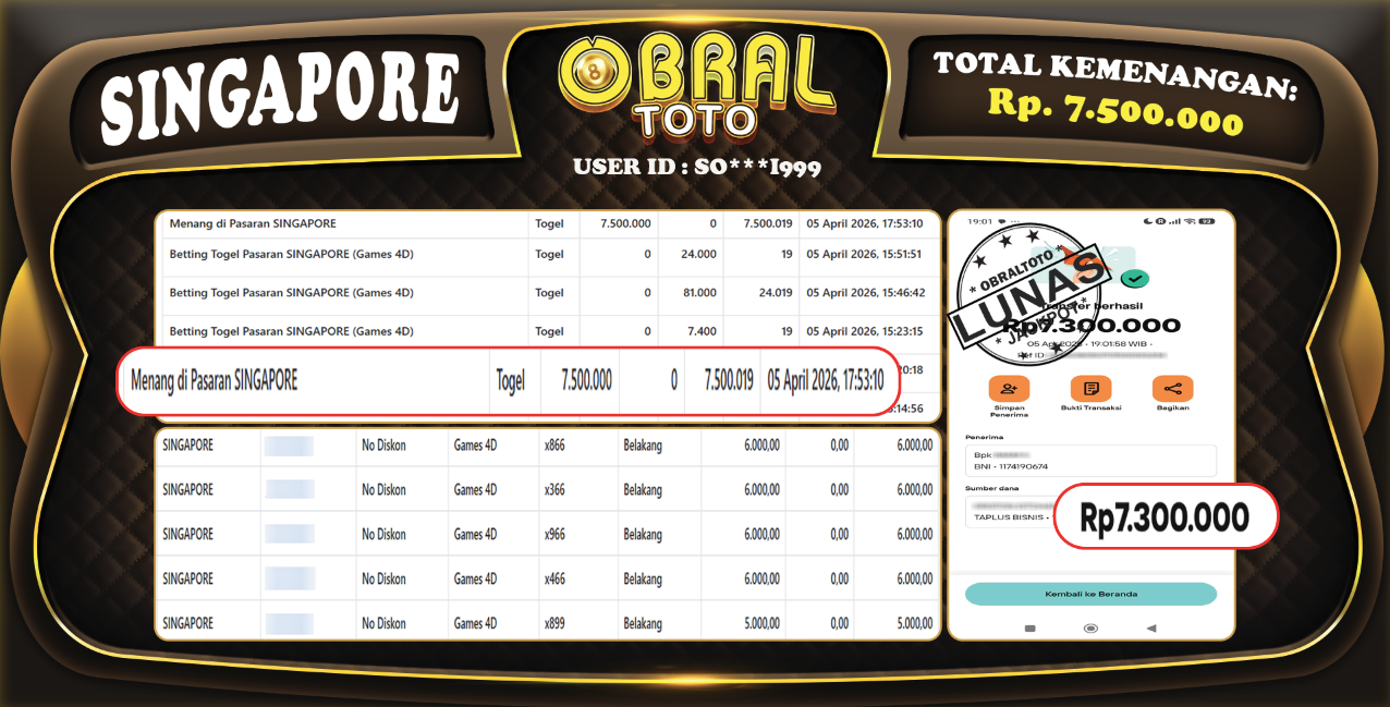 Kami merayakan selamat kepada salah satu pemain setia situs OBRALTOTO yang berhasil meraih kemenangan besar senilai Rp 7.500.000 dalam permainan SINGAPORE pada tanggal 06 APRIL 2026. Kemenangan ini telah kami proses dan pemahaman secara LUNAS ke rekening yang terdaftar. Semoga kemenangan ini menjadi motivasi bagi pemain lainnya untuk terus mencoba keberuntungan dan menikmati permainan di OBRALTOTO .
