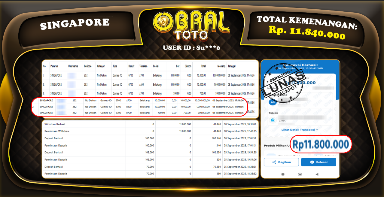 JACKPOT SINGAPORE OBRALTOTO 08 September 2025