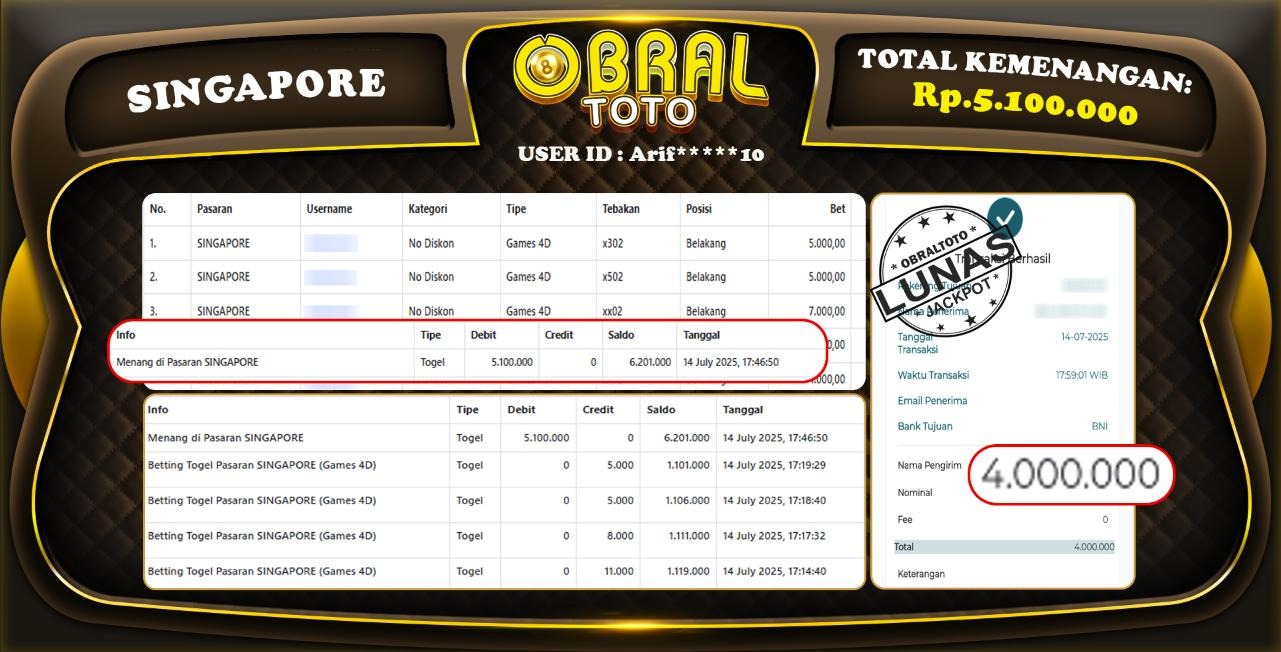 Kami merayakan selamat kepada salah satu pemain setia situs OBRALTOTO yang berhasil meraih kemenangan besar senilai Rp,5.100.000 dalam permainan SINGAPORE pada tanggal 14 JULI 2025. Kemenangan ini telah kami proses dan pemahaman secara LUNAS ke rekening yang terdaftar. Semoga kemenangan ini menjadi motivasi bagi pemain lainnya untuk terus mencoba keberuntungan dan menikmati permainan di OBRALTOTO .