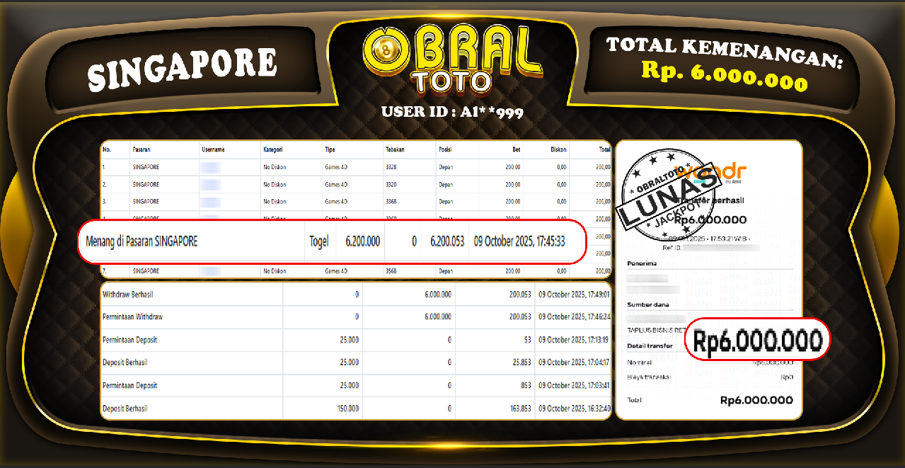 Kami merayakan selamat kepada salah satu pemain setia situs OBRALTOTO yang berhasil meraih kemenangan besar senilai Rp,6.000.000 dalam permainan SINGAPORE pada tanggal 09 October 2025. Kemenangan ini telah kami proses dan pemahaman secara LUNAS ke rekening yang terdaftar. Semoga kemenangan ini menjadi motivasi bagi pemain lainnya untuk terus mencoba keberuntungan dan menikmati permainan di OBRALTOTO .