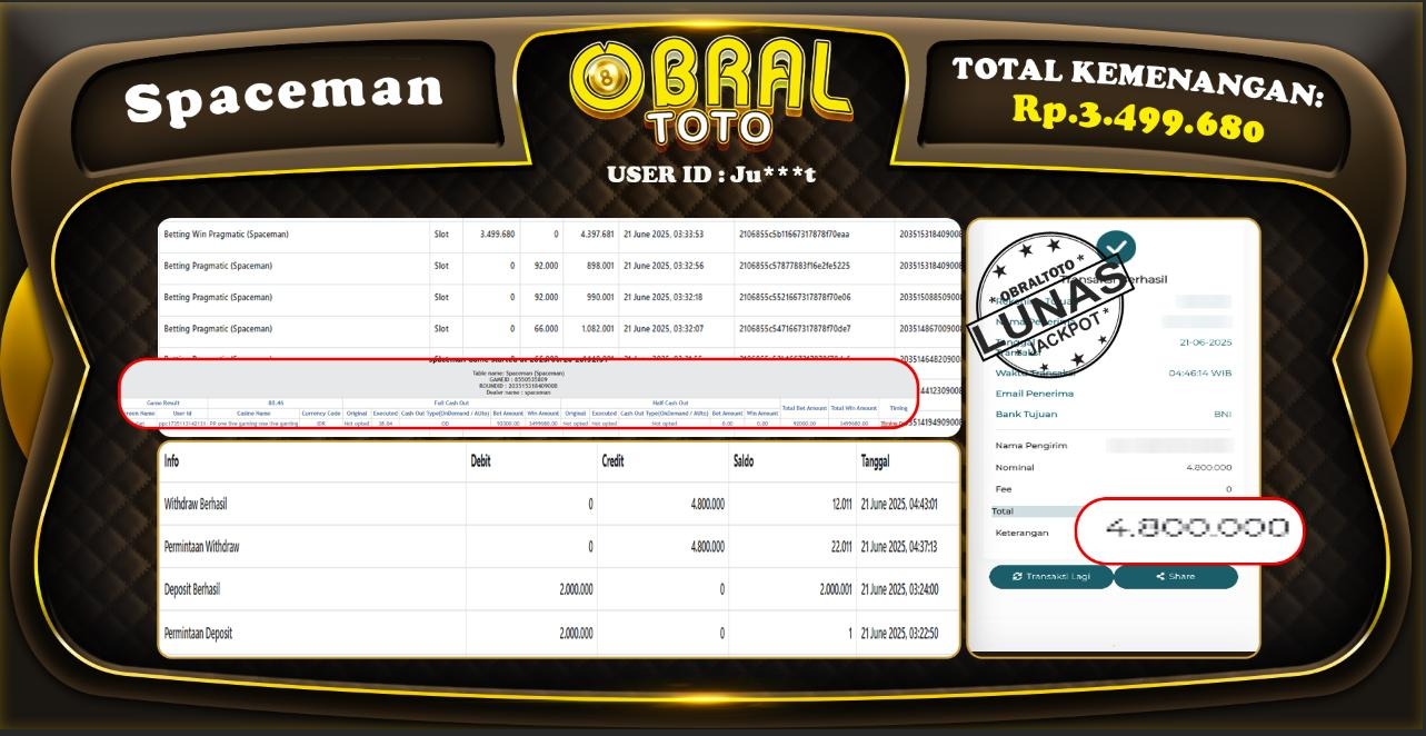 Kami merayakan selamat kepada salah satu pemain setia situs OBRALTOTO yang berhasil meraih kemenangan besar senilai Rp,3.499.680 dalam permainan SPACEMAN pada tanggal 24 JUNI 2025. Kemenangan ini telah kami proses dan pemahaman secara LUNAS ke rekening yang terdaftar. Semoga kemenangan ini menjadi motivasi bagi pemain lainnya untuk terus mencoba keberuntungan dan menikmati permainan di OBRALTOTO .