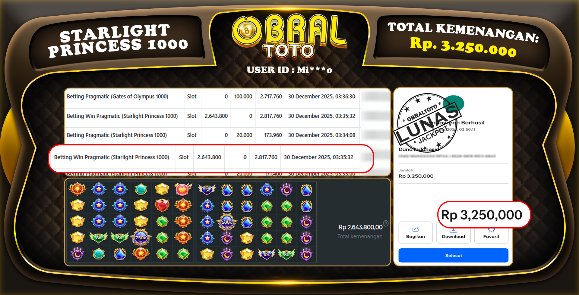 OBRALTOTO – Selamat Kepada Pemenang User id : Mi***o JP STARLIGHT PRINCESS 1000 3.250.000 Juta 30 Desember 2025 – Situs game online terpercaya dengan bukti jp yang telah resmi dan terjamin di Indonesia, memberikan pengalaman bermain yang aman dan menyenangkan bagi para penggemar game online. Dengan hadirnya OBRALTOTO , pemain dapat menikmati kemudahan akses ke berbagai permainan seru, peluang memenangkan hadiah besar, serta keuntungan menarik yang telah disiapkan khusus untuk para member lama maupun member baru. Platform ini dirancang untuk memberikan kenyamanan dan keamanan, sehingga setiap pemain dapat fokus menikmati permainan sekaligus meraih keuntungan maksimal.3.250.000