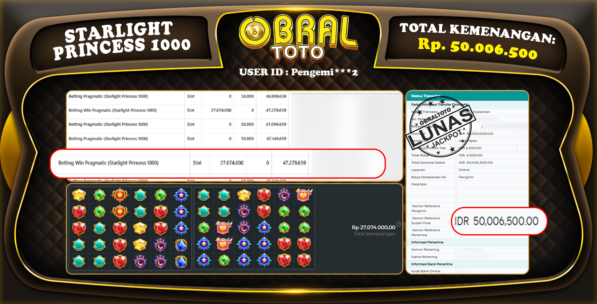 Bukti pembayaran lunas yang ditampilkan merupakan salah satu indikator bahwa situs OBRALTOTO adalah platform slot, togel, & casino yang sangat aman dan terpercaya. Dengan komitmen untuk membayar berapapun kemenangan yang diraih oleh para pemain, OBRALTOTO memastikan pengalaman bermain yang transparan dan memuaskan. Kepercayaan dan kenyamanan pemain adalah prioritas utama, sehingga setiap kemenangan Anda akan selalu dihargai dan dijamin secara penuh tanpa kendala.