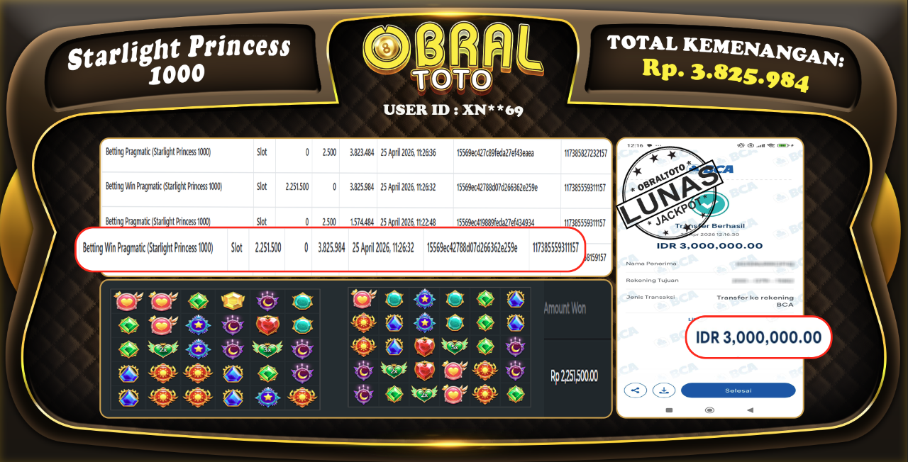 Kami merayakan selamat kepada salah satu pemain setia situs OBRALTOTO yang berhasil meraih kemenangan besar senilai Rp 3.825.984 dalam permainan SLOT STARLIGHT PRINCESS 1000 pada tanggal 26 APRIL 2026 . Kemenangan ini telah kami proses dan pemahaman secara LUNAS ke rekening yang terdaftar. Semoga kemenangan ini menjadi motivasi bagi pemain lainnya untuk terus mencoba keberuntungan dan menikmati permainan di OBRALTOTO.