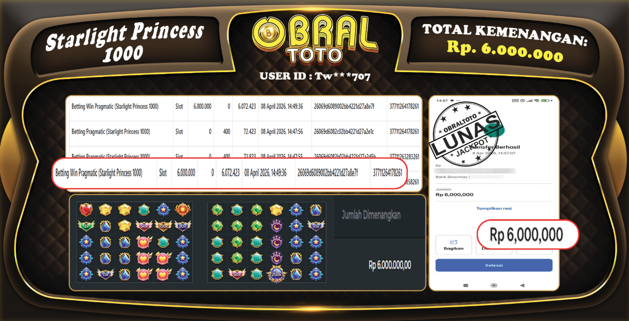 Kami merayakan selamat kepada salah satu pemain setia situs OBRALTOTO yang berhasil meraih kemenangan besar senilai Rp 6.000.000 dalam permainan SLOT STARLIGHT PRINCESS 1000 pada tanggal 09 APRIL 2026 . Kemenangan ini telah kami proses dan pemahaman secara LUNAS ke rekening yang terdaftar. Semoga kemenangan ini menjadi motivasi bagi pemain lainnya untuk terus mencoba keberuntungan dan menikmati permainan di OBRALTOTO.