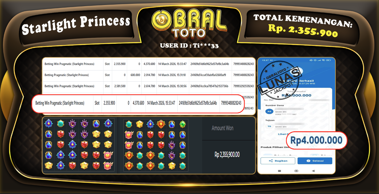 Kami merayakan selamat kepada salah satu pemain setia situs OBRALTOTO yang berhasil meraih kemenangan besar senilai Rp 2,335,900 dalam permainan STARLIGHT PRINCESS pada tanggal 15 MARET 2026 . Kemenangan ini telah kami proses dan pemahaman secara LUNAS ke rekening yang terdaftar. Semoga kemenangan ini menjadi motivasi bagi pemain lainnya untuk terus mencoba keberuntungan dan menikmati permainan di OBRALTOTO.