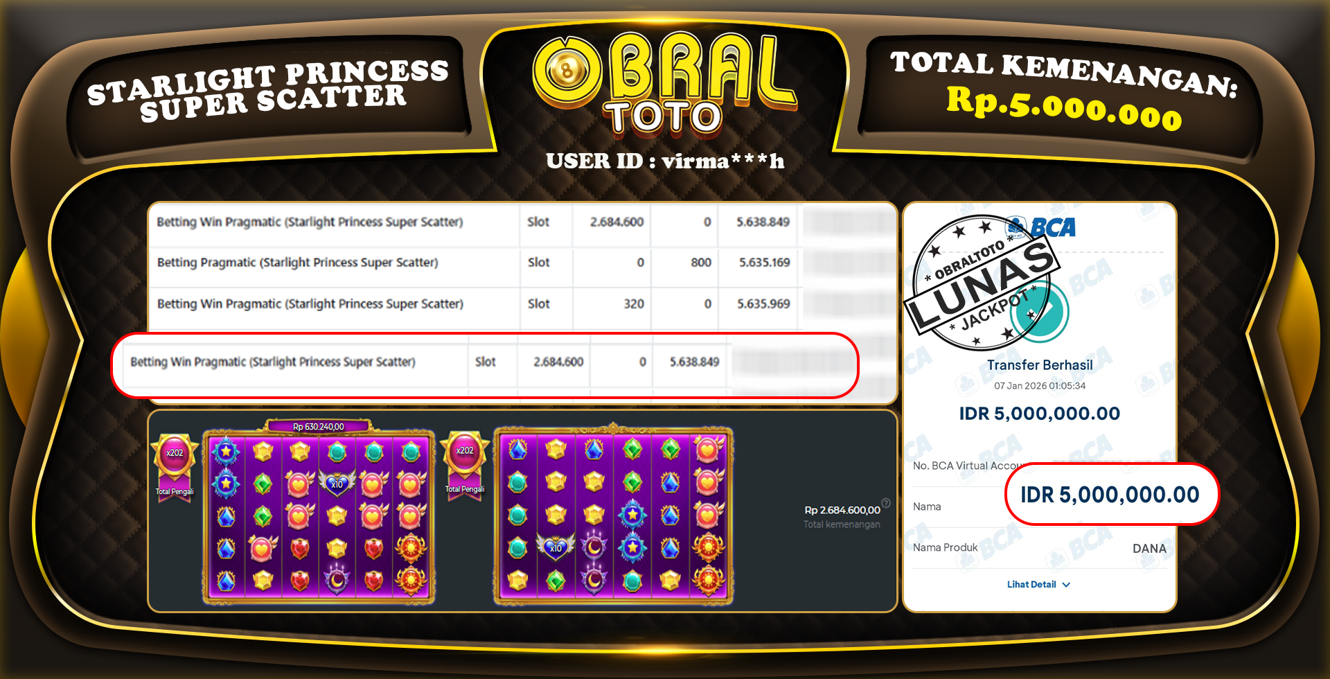 Kami merayakan selamat kepada salah satu pemain setia situs OBRALTOTO yang berhasil meraih kemenangan besar senilai Rp 5.000.000 dalam permainan SLOT STARLIGHT PRINCESS SUPER SCATTER pada tanggal 07 JANUARY 2026 . Kemenangan ini telah kami proses dan pemahaman secara LUNAS ke rekening yang terdaftar. Semoga kemenangan ini menjadi motivasi bagi pemain lainnya untuk terus mencoba keberuntungan dan menikmati permainan di OBRALTOTO.