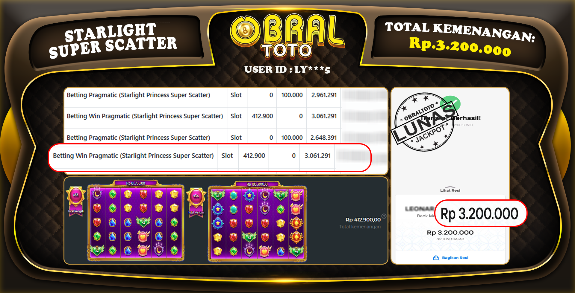Bukti pembayaran lunas yang ditampilkan merupakan salah satu indikator bahwa situs OBRALTOTO adalah platform slot, togel, & casino yang sangat aman dan terpercaya. Dengan komitmen untuk membayar berapapun kemenangan yang diraih oleh para pemain, OBRALTOTO memastikan pengalaman bermain yang transparan dan memuaskan. Kepercayaan dan kenyamanan pemain adalah prioritas utama, sehingga setiap kemenangan Anda akan selalu dihargai dan dijamin secara penuh tanpa kendala.