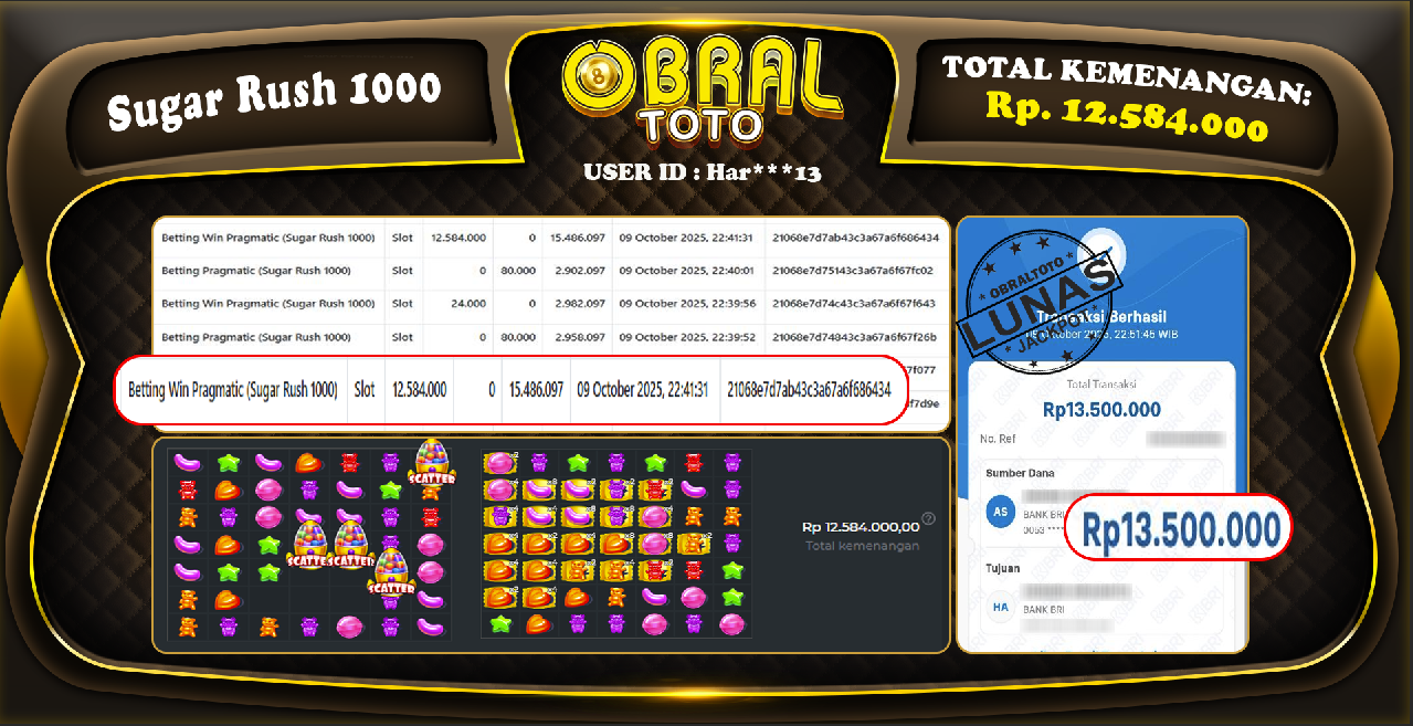 OBRALTOTO – Selamat Kepada Pemenang User id : Har***13 Sugar Rush 1000 12.584.000 Juta 05 October 2025 – Situs game online terpercaya dengan bukti jp yang telah resmi dan terjamin di Indonesia, memberikan pengalaman bermain yang aman dan menyenangkan bagi para penggemar game online. Dengan hadirnya OBRALTOTO , pemain dapat menikmati kemudahan akses ke berbagai permainan seru, peluang memenangkan hadiah besar, serta keuntungan menarik yang telah disiapkan khusus untuk para member lama maupun member baru. Platform ini dirancang untuk memberikan kenyamanan dan keamanan, sehingga setiap pemain dapat fokus menikmati permainan sekaligus meraih keuntungan maksimal.