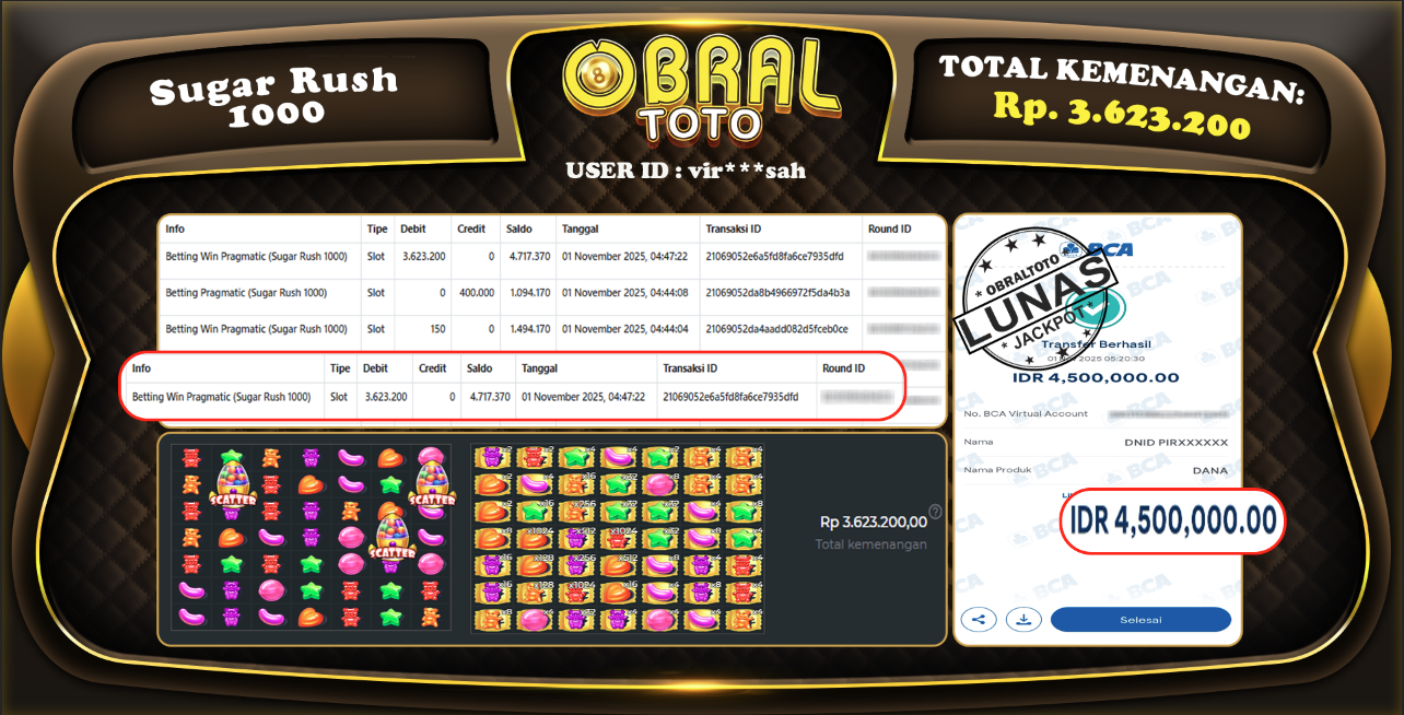 Kami merayakan selamat kepada salah satu pemain setia situs OBRALTOTO  yang berhasil meraih kemenangan besar senilai Rp 3.623.200 dalam permainan SLOT SUGAR RUSH 1000 pada tanggal 01 November 2025. Kemenangan ini telah kami proses dan pemahaman secara LUNAS ke rekening yang terdaftar. Semoga kemenangan ini menjadi motivasi bagi pemain lainnya untuk terus mencoba keberuntungan dan menikmati permainan di OBRALTOTO .