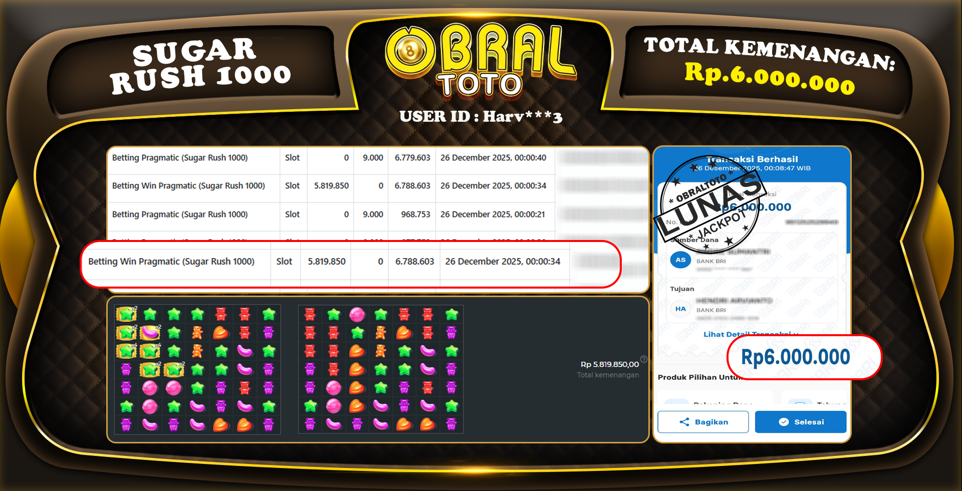 OBRALTOTO – Selamat Kepada Pemenang User id : Harv*****3 Sugar Rush 1000 6.000.000 Juta 27 DESEMBER 2025 – Situs game online terpercaya dengan bukti jp yang telah resmi dan terjamin di Indonesia, memberikan pengalaman bermain yang aman dan menyenangkan bagi para penggemar game online. Dengan hadirnya OBRALTOTO , pemain dapat menikmati kemudahan akses ke berbagai permainan seru, peluang memenangkan hadiah besar, serta keuntungan menarik yang telah disiapkan khusus untuk para member lama maupun member baru. Platform ini dirancang untuk memberikan kenyamanan dan keamanan, sehingga setiap pemain dapat fokus menikmati permainan sekaligus meraih keuntungan maksimal.