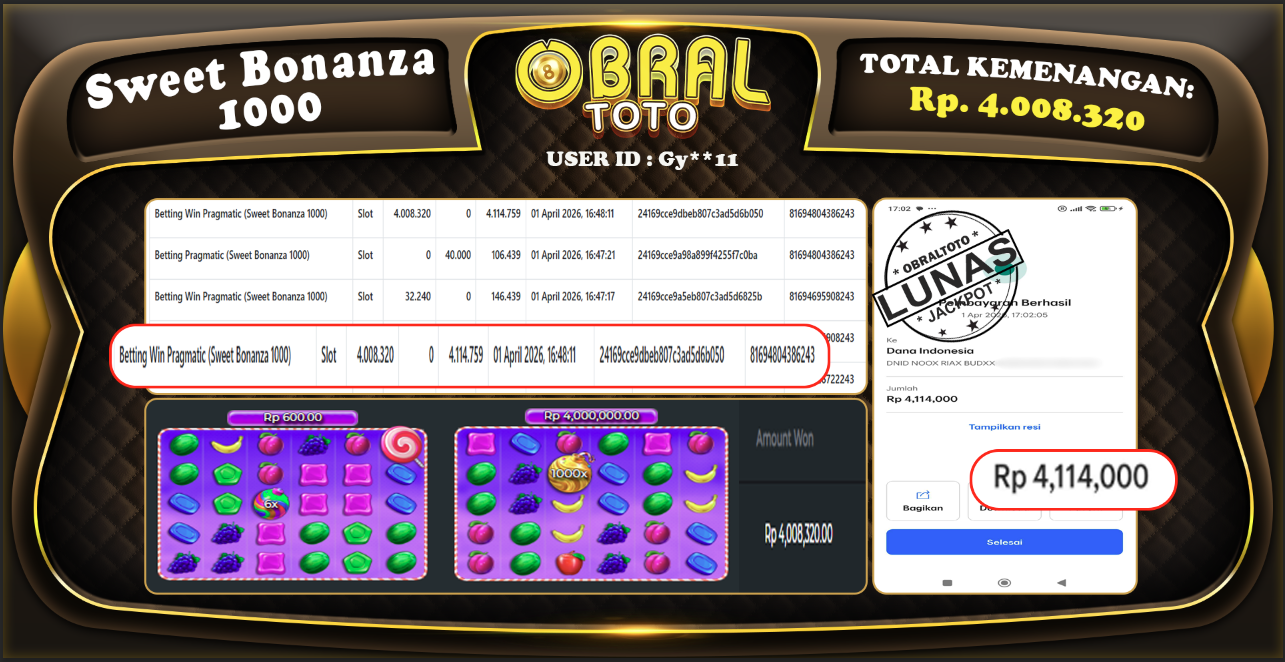 Kami merayakan selamat kepada salah satu pemain setia situs OBRALTOTO yang berhasil meraih kemenangan besar senilai Rp 4.008.320 dalam permainan SLOT SWEET BONANZA 1000 pada tanggal 02 APRIL 2026 . Kemenangan ini telah kami proses dan pemahaman secara LUNAS ke rekening yang terdaftar. Semoga kemenangan ini menjadi motivasi bagi pemain lainnya untuk terus mencoba keberuntungan dan menikmati permainan di OBRALTOTO.