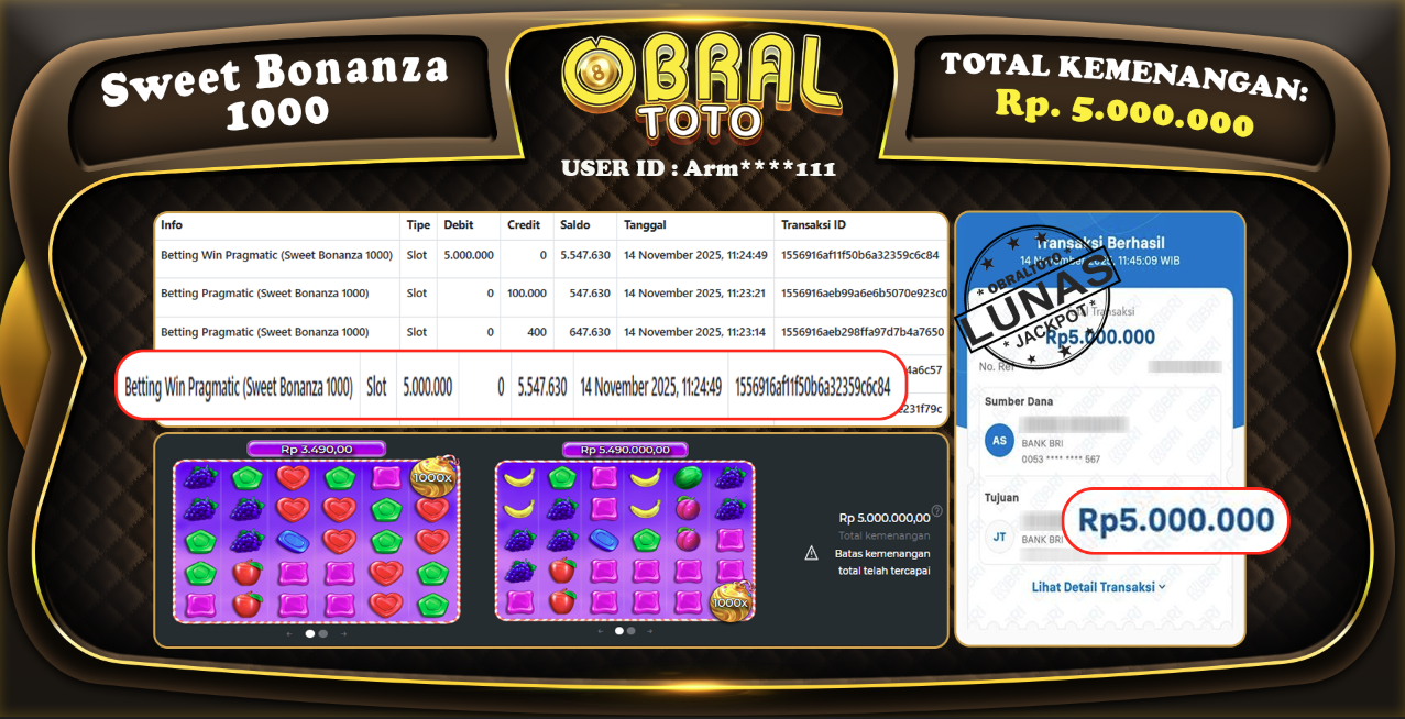 OBRALTOTO – Selamat Kepada Pemenang User id : Arm***111 JP SWEET BONANZA 1000 Rp,5.000.000 14 November 2025- Situs game online terpercaya dengan bukti jp yang telah resmi dan terjamin di Indonesia, memberikan pengalaman bermain yang aman dan menyenangkan bagi para penggemar game online. Dengan hadirnya OBRALTOTO , pemain dapat menikmati kemudahan akses ke berbagai permainan seru, peluang memenangkan hadiah besar, serta keuntungan menarik yang telah disiapkan khusus untuk para member lama maupun member baru. Platform ini dirancang untuk memberikan kenyamanan dan keamanan, sehingga setiap pemain dapat fokus menikmati permainan sekaligus meraih keuntungan maksimal.