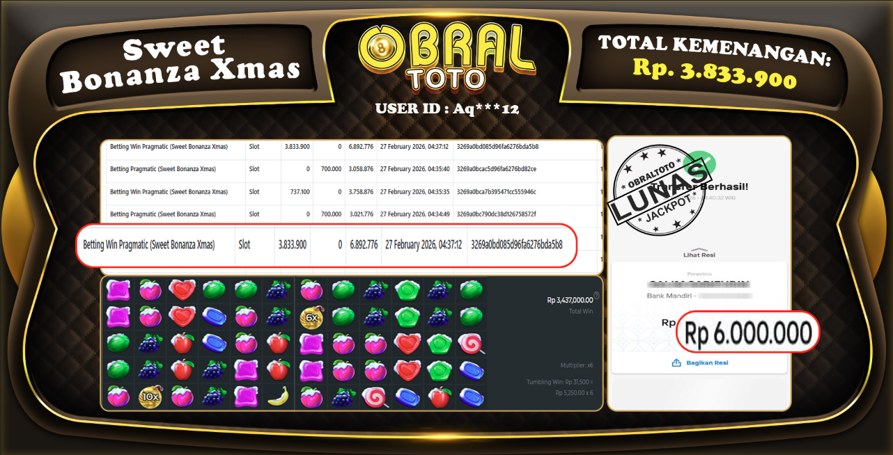 OBRALTOTO – Selamat Kepada Pemenang User id : Aq***12 JP SWEET BONANZA XMAS Rp,3.833.900 Juta 27 Februari 2026- Situs game online terpercaya dengan bukti jp yang telah resmi dan terjamin di Indonesia, memberikan pengalaman bermain yang aman dan menyenangkan bagi para penggemar game online. Dengan hadirnya OBRALTOTO , pemain dapat menikmati kemudahan akses ke berbagai permainan seru, peluang memenangkan hadiah besar, serta keuntungan menarik yang telah disiapkan khusus untuk para member lama maupun member baru. Platform ini dirancang untuk memberikan kenyamanan dan keamanan, sehingga setiap pemain dapat fokus menikmati permainan sekaligus meraih keuntungan maksimal.