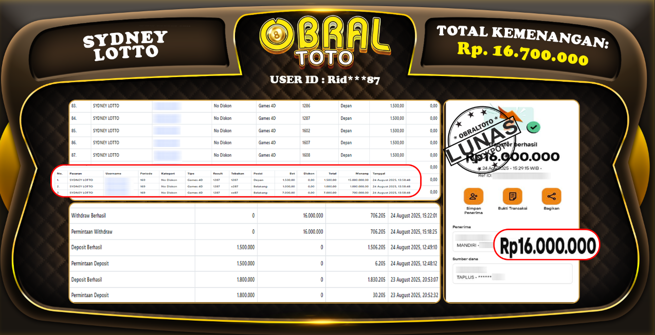 Kami merayakan selamat kepada salah satu pemain setia situs OBRALTOTO yang berhasil meraih kemenangan besar senilai Rp,16.700.000 dalam permainan SYDNEY LOTTO pada tanggal 24 Agustus 2025. Kemenangan ini telah kami proses dan pemahaman secara LUNAS ke rekening yang terdaftar. Semoga kemenangan ini menjadi motivasi bagi pemain lainnya untuk terus mencoba keberuntungan dan menikmati permainan di OBRALTOTO .