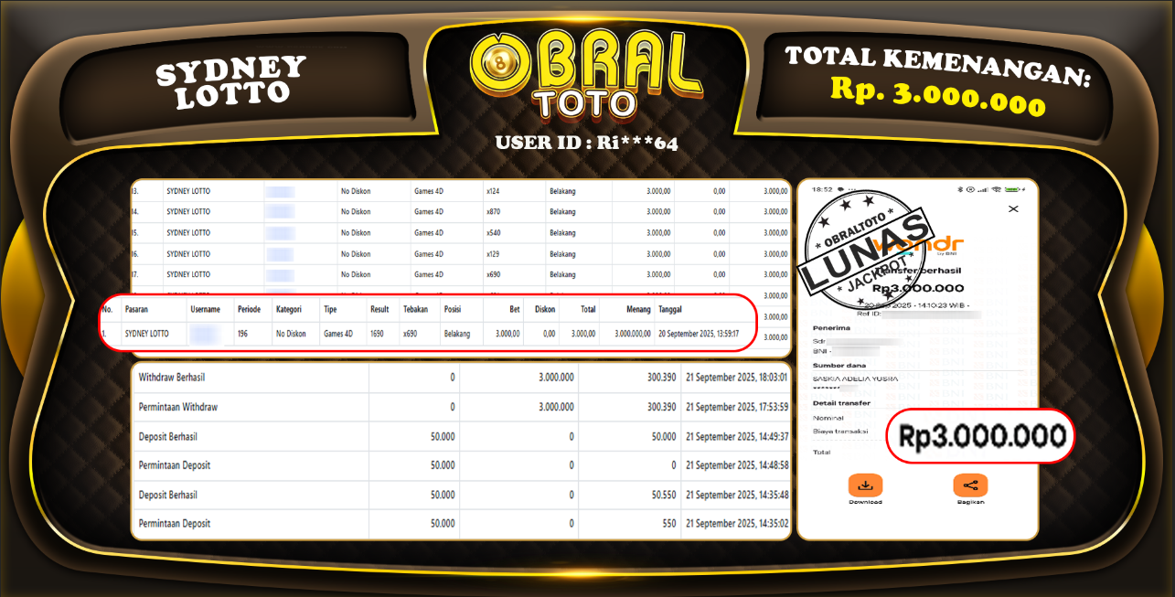 Kami merayakan selamat kepada salah satu pemain setia situs OBRALTOTO yang berhasil meraih kemenangan besar senilai Rp,3.000.000 dalam permainan SYDNEY LOTTO pada tanggal 20 September 2025. Kemenangan ini telah kami proses dan pemahaman secara LUNAS ke rekening yang terdaftar. Semoga kemenangan ini menjadi motivasi bagi pemain lainnya untuk terus mencoba keberuntungan dan menikmati permainan di OBRALTOTO .