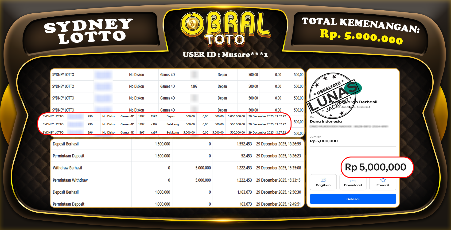 Kami merayakan selamat kepada salah satu pemain setia situs OBRALTOTO yang berhasil meraih kemenangan besar senilai Rp,5.000.000 dalam permainan SYDNEY LOTTO pada tanggal 30 DECEMBER 2025. Kemenangan ini telah kami proses dan pemahaman secara LUNAS ke rekening yang terdaftar. Semoga kemenangan ini menjadi motivasi bagi pemain lainnya untuk terus mencoba keberuntungan dan menikmati permainan di OBRALTOTO .