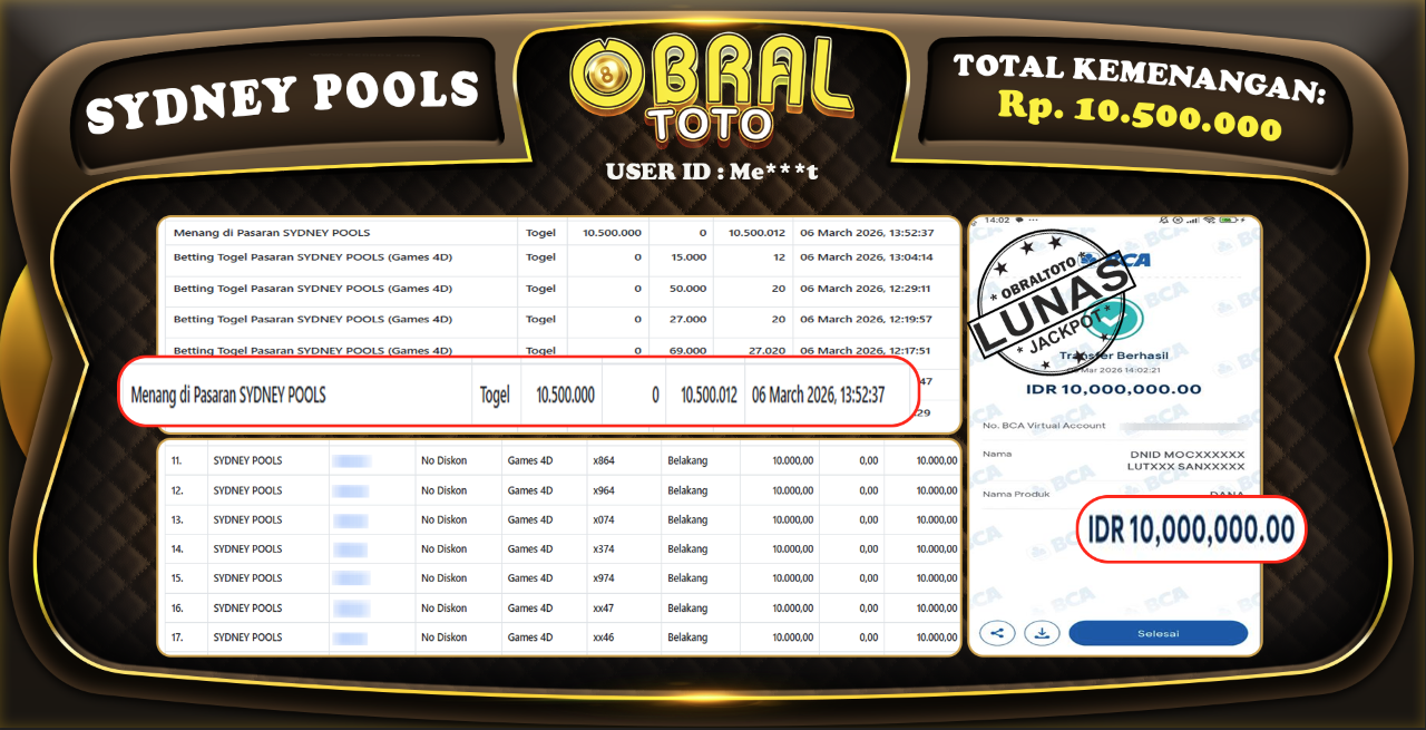 Kami merayakan selamat kepada salah satu pemain setia situs OBRALTOTO yang berhasil meraih kemenangan besar senilai Rp, 10,500,000 dalam permainan SYDNEY POOLS pada tanggal 07 Maret 2026. Kemenangan ini telah kami proses dan pemahaman secara LUNAS ke rekening yang terdaftar. Semoga kemenangan ini menjadi motivasi bagi pemain lainnya untuk terus mencoba keberuntungan dan menikmati permainan di OBRALTOTO .