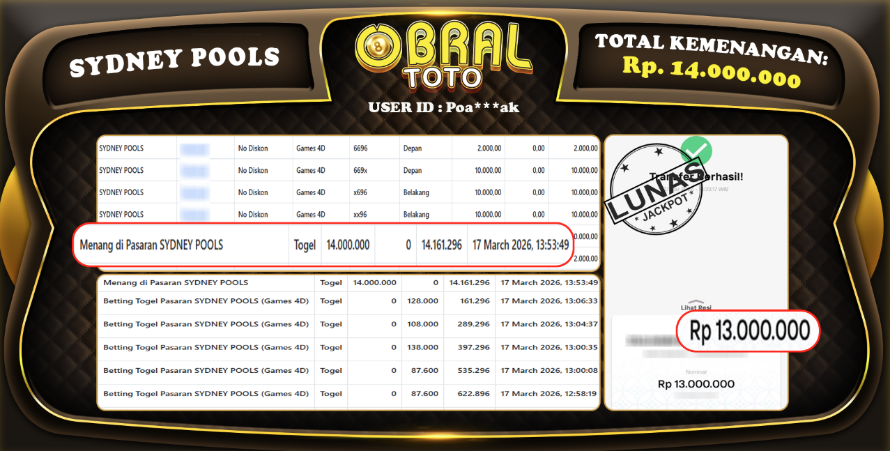 Kami merayakan selamat kepada salah satu pemain setia situs OBRALTOTO yang berhasil meraih kemenangan besar senilai Rp 14.000.000  dalam permainan SYDNEY POOLS pada tanggal 20 Maret 2026. Kemenangan ini telah kami proses dan pemahaman secara LUNAS ke rekening yang terdaftar. Semoga kemenangan ini menjadi motivasi bagi pemain lainnya untuk terus mencoba keberuntungan dan menikmati permainan di OBRALTOTO .