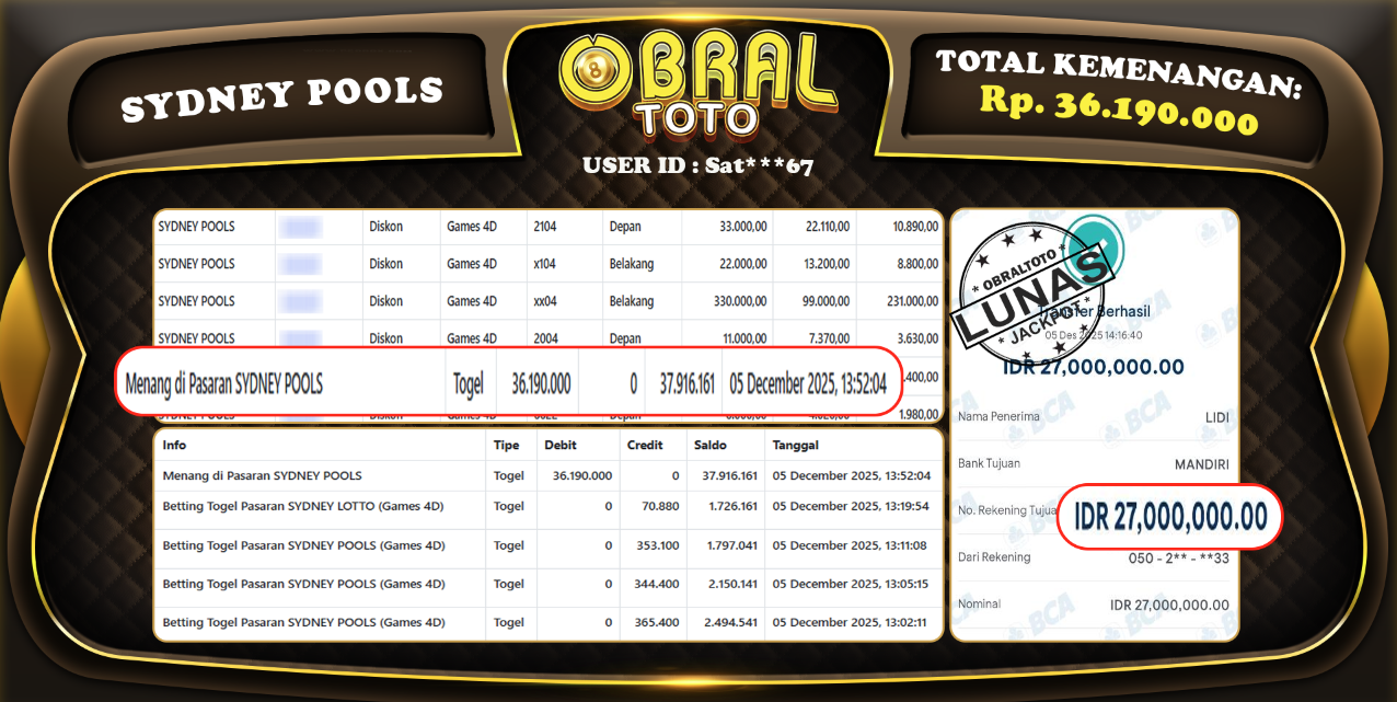 Kami merayakan selamat kepada salah satu pemain setia situs OBRALTOTO yang berhasil meraih kemenangan besar senilai Rp,4.200.000 dalam permainan SYDNEY POOLS pada tanggal 28 November 2025. Kemenangan ini telah kami proses dan pemahaman secara LUNAS ke rekening yang terdaftar. Semoga kemenangan ini menjadi motivasi bagi pemain lainnya untuk terus mencoba keberuntungan dan menikmati permainan di OBRALTOTO .