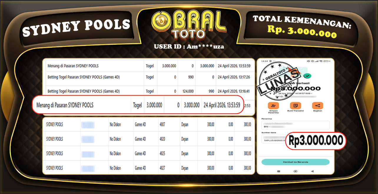 Kami merayakan selamat kepada salah satu pemain setia situs OBRALTOTO yang berhasil meraih kemenangan besar senilai Rp 3.000.000 dalam permainan SYDNEY POOLS pada tanggal 25 APRIL 2026. Kemenangan ini telah kami proses dan pemahaman secara LUNAS ke rekening yang terdaftar. Semoga kemenangan ini menjadi motivasi bagi pemain lainnya untuk terus mencoba keberuntungan dan menikmati permainan di OBRALTOTO .