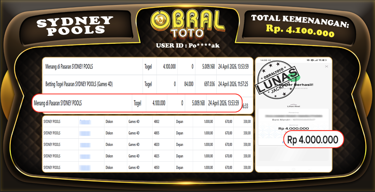 Kami merayakan selamat kepada salah satu pemain setia situs OBRALTOTO yang berhasil meraih kemenangan besar senilai Rp 4.100.000 dalam permainan SYDNEY POOLS pada tanggal 25 APRIL 2026. Kemenangan ini telah kami proses dan pemahaman secara LUNAS ke rekening yang terdaftar. Semoga kemenangan ini menjadi motivasi bagi pemain lainnya untuk terus mencoba keberuntungan dan menikmati permainan di OBRALTOTO .