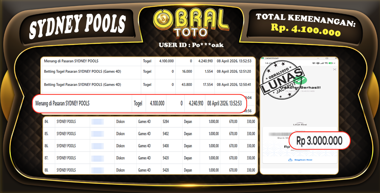 Kami merayakan selamat kepada salah satu pemain setia situs OBRALTOTO yang berhasil meraih kemenangan besar senilai Rp 4.100.000  dalam permainan SYDNEY POOLS pada tanggal 09 APRIL 2026. Kemenangan ini telah kami proses dan pemahaman secara LUNAS ke rekening yang terdaftar. Semoga kemenangan ini menjadi motivasi bagi pemain lainnya untuk terus mencoba keberuntungan dan menikmati permainan di OBRALTOTO .