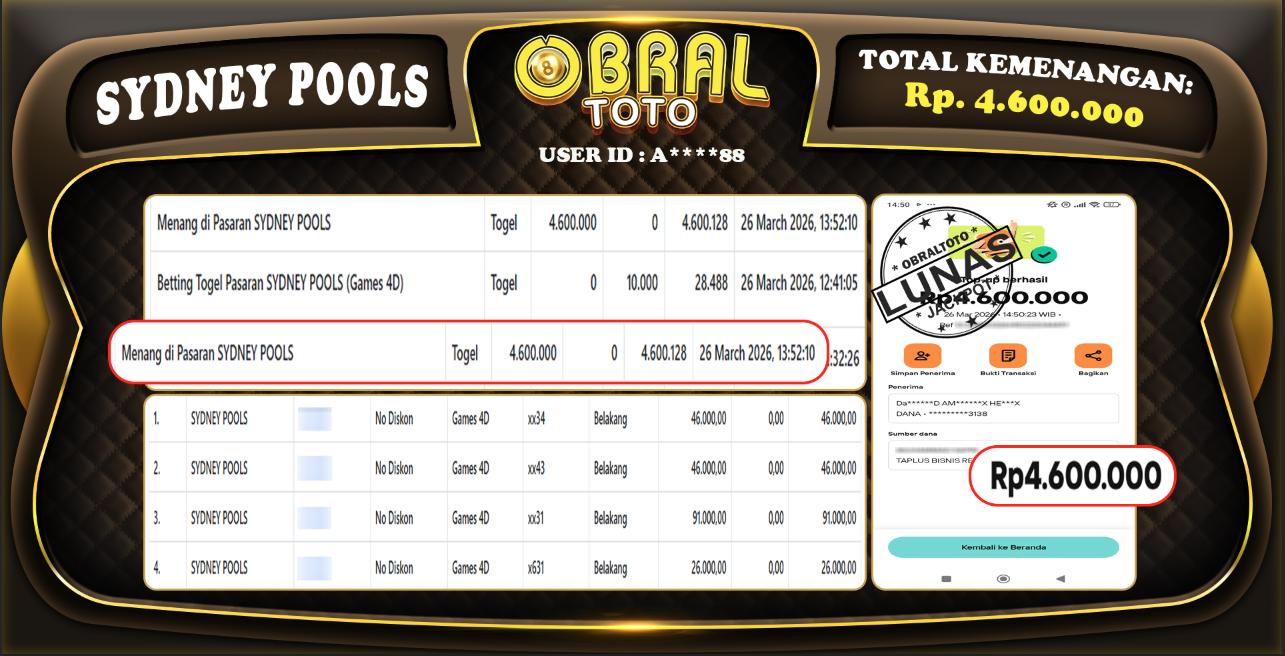 Kami merayakan selamat kepada salah satu pemain setia situs OBRALTOTO yang berhasil meraih kemenangan besar senilai Rp 4.600.000  dalam permainan SYDNEY POOLS pada tanggal 27 Maret 2026. Kemenangan ini telah kami proses dan pemahaman secara LUNAS ke rekening yang terdaftar. Semoga kemenangan ini menjadi motivasi bagi pemain lainnya untuk terus mencoba keberuntungan dan menikmati permainan di OBRALTOTO .