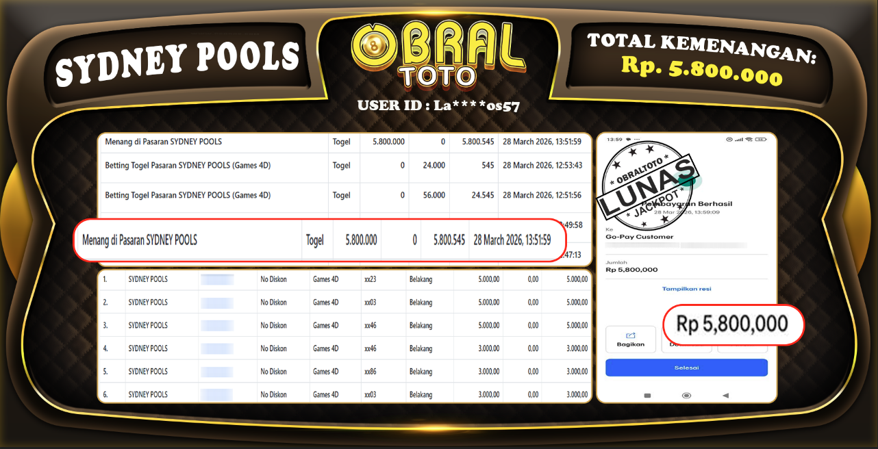 Kami merayakan selamat kepada salah satu pemain setia situs OBRALTOTO yang berhasil meraih kemenangan besar senilai Rp 5.800.000  dalam permainan SYDNEY POOLS pada tanggal 29 Maret 2026. Kemenangan ini telah kami proses dan pemahaman secara LUNAS ke rekening yang terdaftar. Semoga kemenangan ini menjadi motivasi bagi pemain lainnya untuk terus mencoba keberuntungan dan menikmati permainan di OBRALTOTO .