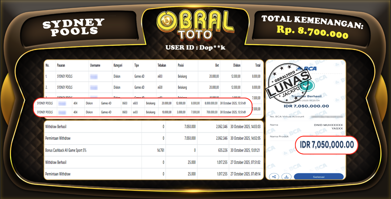 Kami merayakan selamat kepada salah satu pemain setia situs OBRALTOTO yang berhasil meraih kemenangan besar senilai Rp,8.700.000 dalam permainan SYDNEY POOLS pada tanggal 31 Oktober 2025. Kemenangan ini telah kami proses dan pemahaman secara LUNAS ke rekening yang terdaftar. Semoga kemenangan ini menjadi motivasi bagi pemain lainnya untuk terus mencoba keberuntungan dan menikmati permainan di OBRALTOTO .