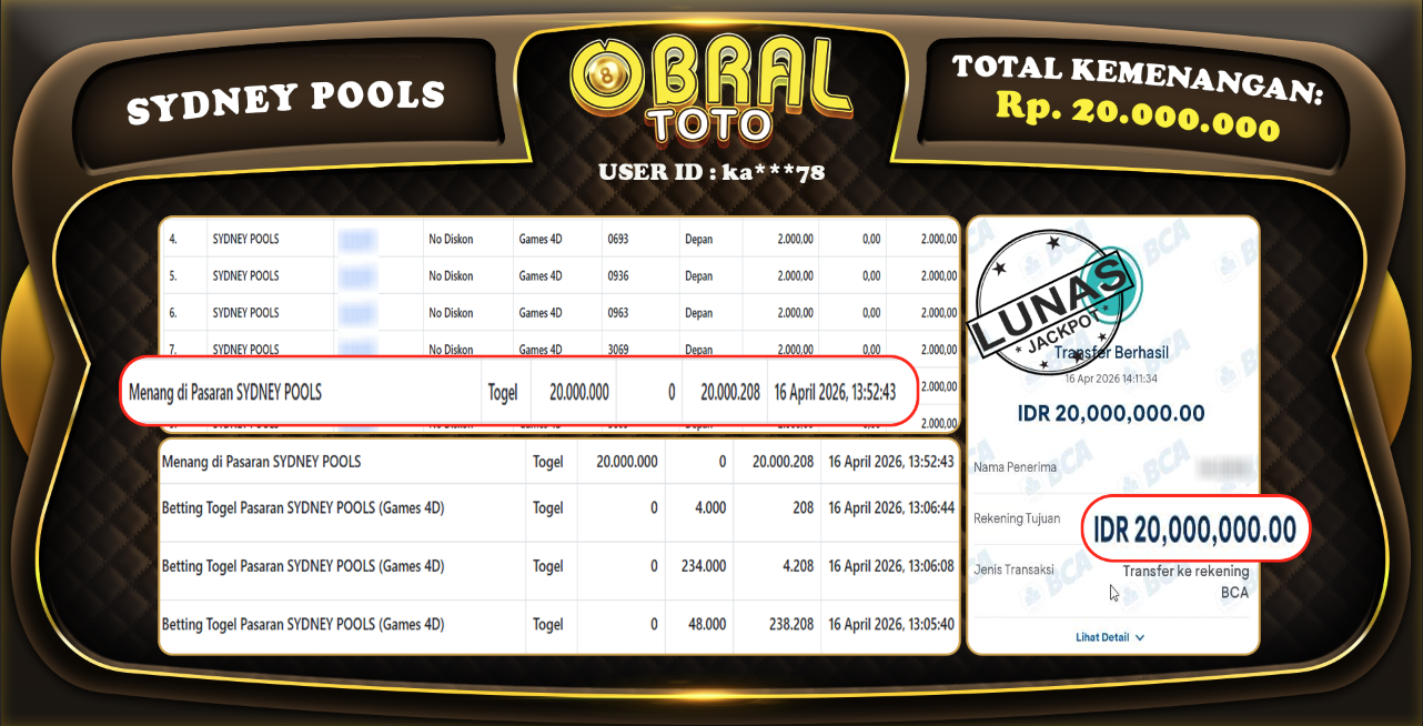 Kami merayakan selamat kepada salah satu pemain setia situs OBRALTOTO yang berhasil meraih kemenangan besar senilai Rp 20.000.000 dalam permainan SYDNEY POOLS pada tanggal 20 APRIL 2026. Kemenangan ini telah kami proses dan pemahaman secara LUNAS ke rekening yang terdaftar. Semoga kemenangan ini menjadi motivasi bagi pemain lainnya untuk terus mencoba keberuntungan dan menikmati permainan di OBRALTOTO .