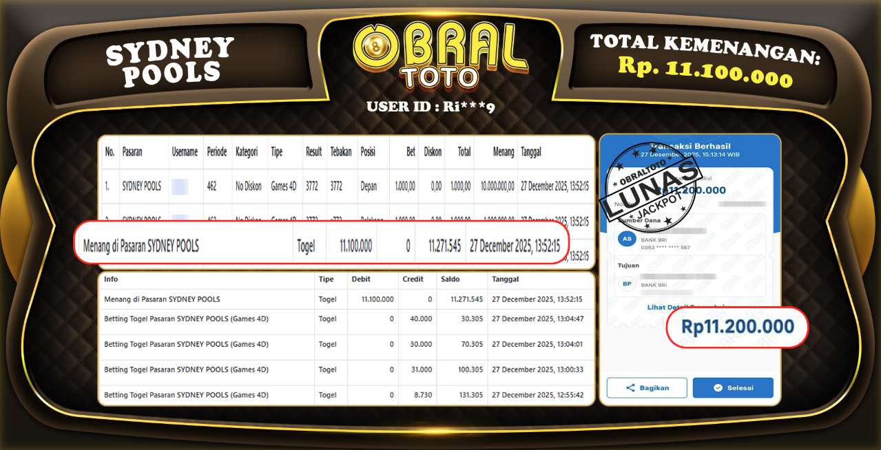 Kami merayakan selamat kepada salah satu pemain setia situs OBRALTOTO yang berhasil meraih kemenangan besar senilai Rp,4.200.000 dalam permainan SYDNEY POOLS pada tanggal 28 November 2025. Kemenangan ini telah kami proses dan pemahaman secara LUNAS ke rekening yang terdaftar. Semoga kemenangan ini menjadi motivasi bagi pemain lainnya untuk terus mencoba keberuntungan dan menikmati permainan di OBRALTOTO .