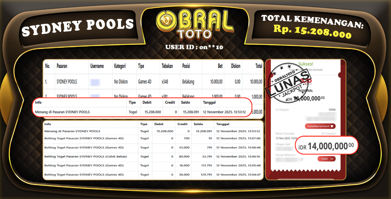 Kami merayakan selamat kepada salah satu pemain setia situs OBRALTOTO yang berhasil meraih kemenangan besar senilai Rp,15.208.000 dalam permainan SYDNEY POOLS pada tanggal 13 November 2025. Kemenangan ini telah kami proses dan pemahaman secara LUNAS ke rekening yang terdaftar. Semoga kemenangan ini menjadi motivasi bagi pemain lainnya untuk terus mencoba keberuntungan dan menikmati permainan di OBRALTOTO .