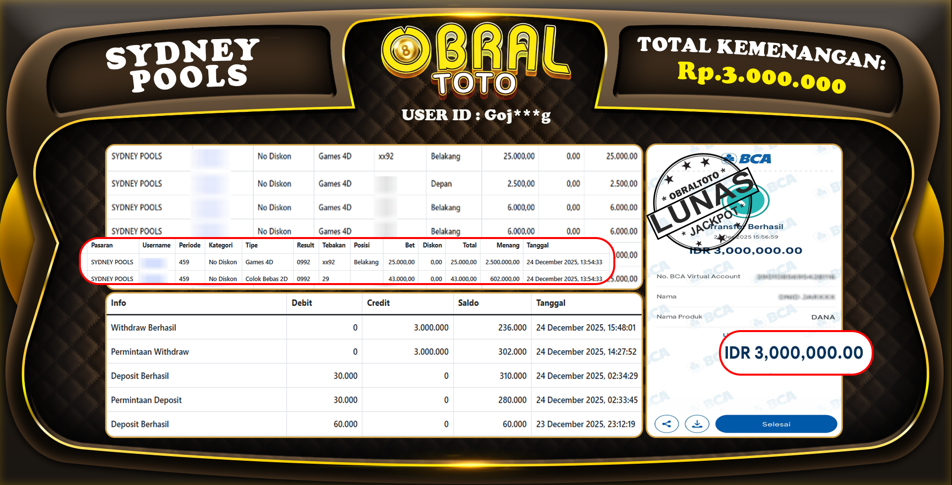 Kami merayakan selamat kepada salah satu pemain setia situs OBRALTOTO yang berhasil meraih kemenangan besar senilai Rp,4.200.000 dalam permainan SYDNEY POOLS pada tanggal 28 November 2025. Kemenangan ini telah kami proses dan pemahaman secara LUNAS ke rekening yang terdaftar. Semoga kemenangan ini menjadi motivasi bagi pemain lainnya untuk terus mencoba keberuntungan dan menikmati permainan di OBRALTOTO .
