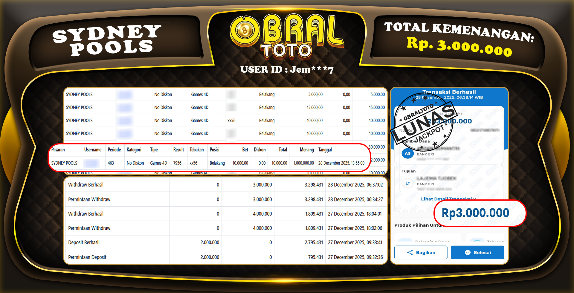 Kami merayakan selamat kepada salah satu pemain setia situs OBRALTOTO yang berhasil meraih kemenangan besar senilai Rp,4.200.000 dalam permainan SYDNEY POOLS pada tanggal 28 November 2025. Kemenangan ini telah kami proses dan pemahaman secara LUNAS ke rekening yang terdaftar. Semoga kemenangan ini menjadi motivasi bagi pemain lainnya untuk terus mencoba keberuntungan dan menikmati permainan di OBRALTOTO .