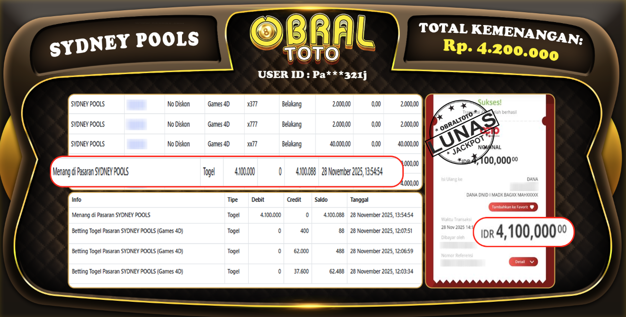 Kami merayakan selamat kepada salah satu pemain setia situs OBRALTOTO yang berhasil meraih kemenangan besar senilai Rp,4.200.000  dalam permainan SYDNEY POOLS pada tanggal 28 November 2025. Kemenangan ini telah kami proses dan pemahaman secara LUNAS ke rekening yang terdaftar. Semoga kemenangan ini menjadi motivasi bagi pemain lainnya untuk terus mencoba keberuntungan dan menikmati permainan di OBRALTOTO .