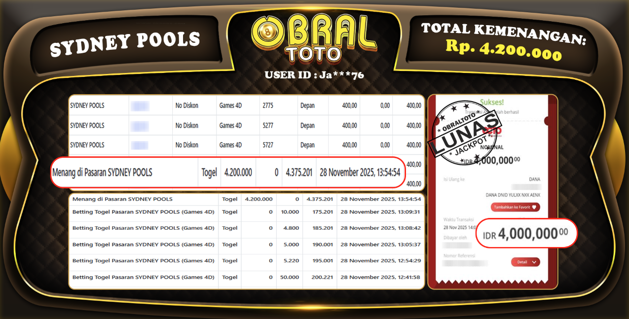 Kami merayakan selamat kepada salah satu pemain setia situs OBRALTOTO yang berhasil meraih kemenangan besar senilai Rp,4.200.000 dalam permainan SYDNEY POOLS pada tanggal 28 November 2025. Kemenangan ini telah kami proses dan pemahaman secara LUNAS ke rekening yang terdaftar. Semoga kemenangan ini menjadi motivasi bagi pemain lainnya untuk terus mencoba keberuntungan dan menikmati permainan di OBRALTOTO .