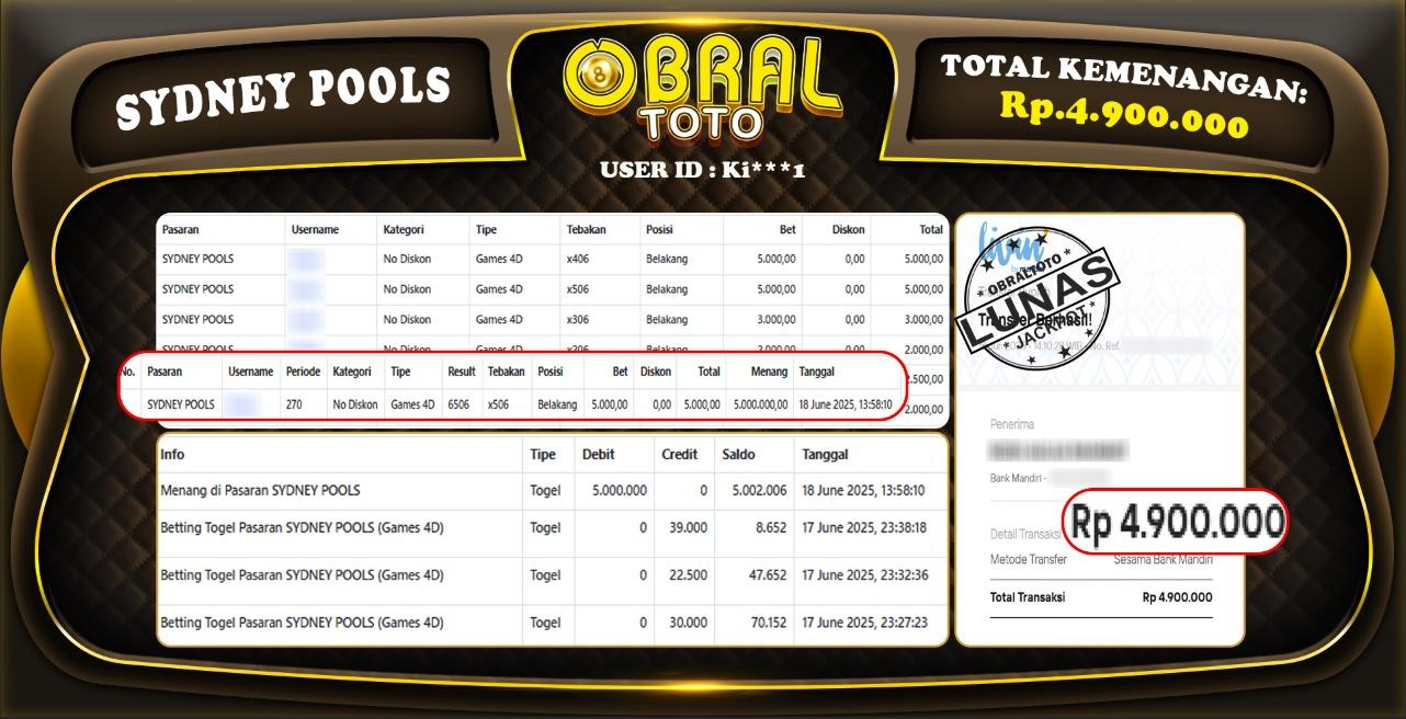 Kami merayakan selamat kepada salah satu pemain setia situs OBRALTOTO yang berhasil meraih kemenangan besar senilai Rp,4.900.00 dalam permainan SYDNEY POOLS pada tanggal 18 JUNI 2025. Kemenangan ini telah kami proses dan pemahaman secara LUNAS ke rekening yang terdaftar. Semoga kemenangan ini menjadi motivasi bagi pemain lainnya untuk terus mencoba keberuntungan dan menikmati permainan di OBRALTOTO .