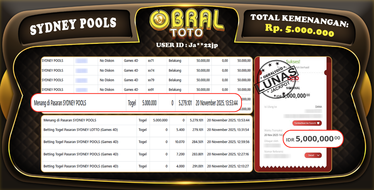 Kami merayakan selamat kepada salah satu pemain setia situs OBRALTOTO yang berhasil meraih kemenangan besar senilai Rp,5.000.000 dalam permainan SYDNEY POOLS pada tanggal 21 November 2025. Kemenangan ini telah kami proses dan pemahaman secara LUNAS ke rekening yang terdaftar. Semoga kemenangan ini menjadi motivasi bagi pemain lainnya untuk terus mencoba keberuntungan dan menikmati permainan di OBRALTOTO .