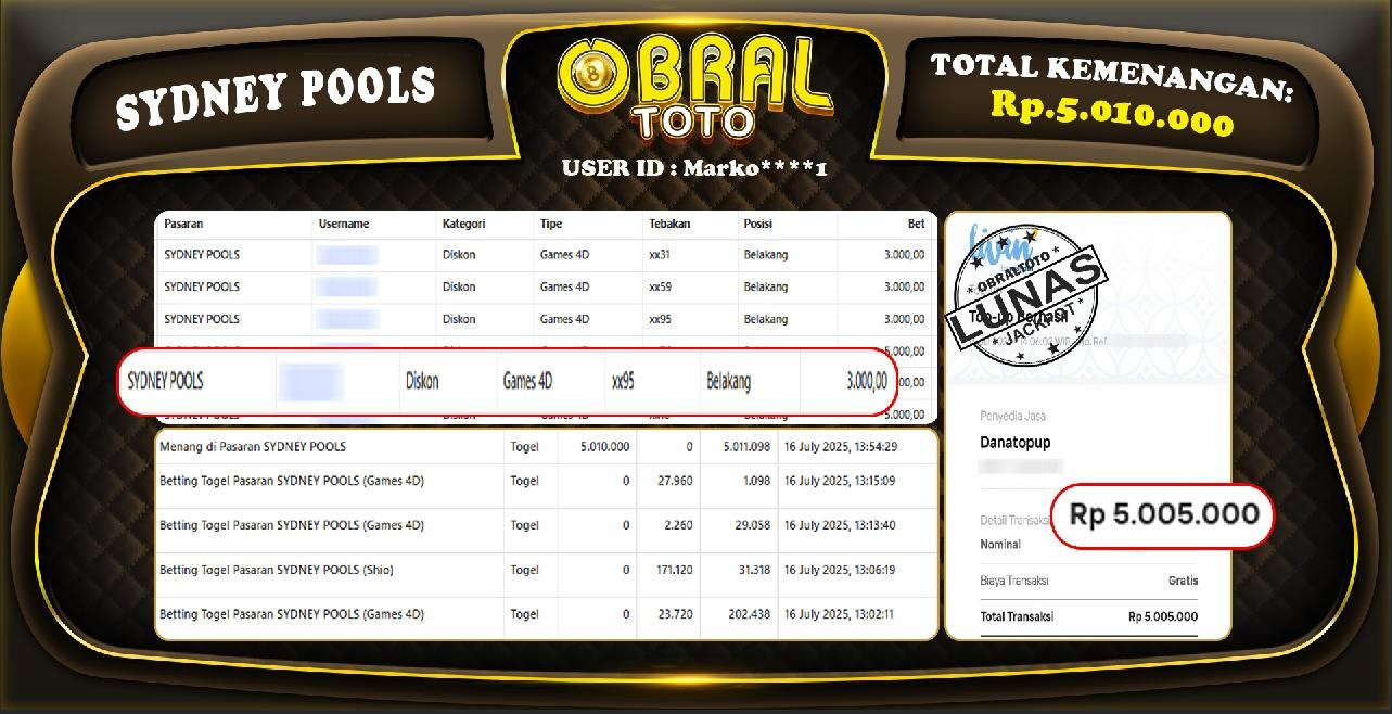 Kami merayakan selamat kepada salah satu pemain setia situs OBRALTOTO yang berhasil meraih kemenangan besar senilai Rp,5.010.000 dalam permainan SYDNEY POOLS pada tanggal 16 JULI 2025. Kemenangan ini telah kami proses dan pemahaman secara LUNAS ke rekening yang terdaftar. Semoga kemenangan ini menjadi motivasi bagi pemain lainnya untuk terus mencoba keberuntungan dan menikmati permainan di OBRALTOTO .