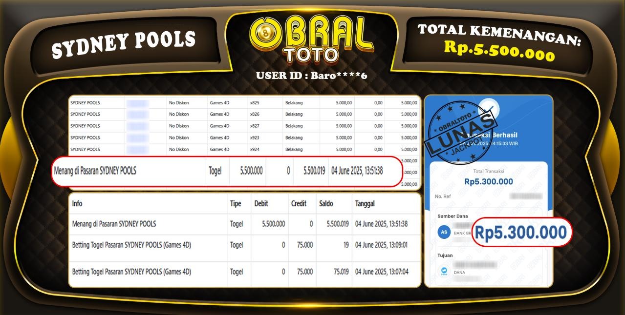 Kami merayakan selamat kepada salah satu pemain setia situs OBRALTOTO yang berhasil meraih kemenangan besar senilai Rp,5.500.000 dalam permainan SYDNEY POOLS pada tanggal 04 JUNI 2025. Kemenangan ini telah kami proses dan pemahaman secara LUNAS ke rekening yang terdaftar. Semoga kemenangan ini menjadi motivasi bagi pemain lainnya untuk terus mencoba keberuntungan dan menikmati permainan di OBRALTOTO .