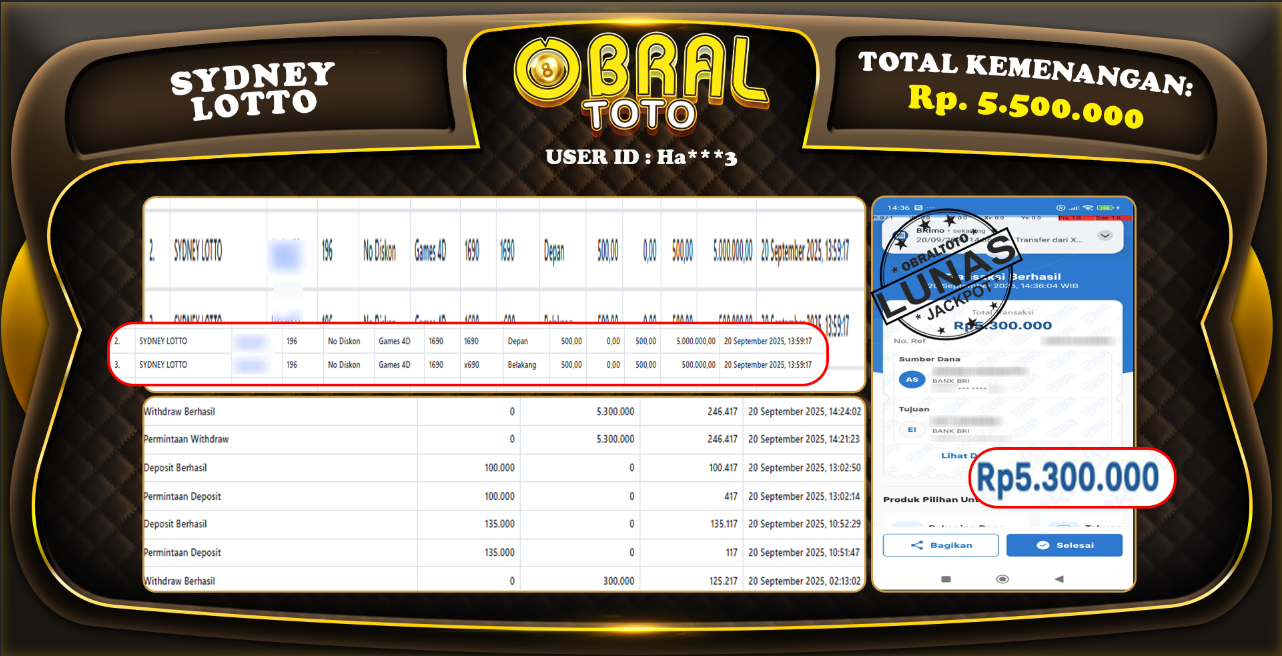 Kami merayakan selamat kepada salah satu pemain setia situs OBRALTOTO yang berhasil meraih kemenangan besar senilai Rp,5.500.000 dalam permainan SYDNEY POOLS pada tanggal 20 September 2025. Kemenangan ini telah kami proses dan pemahaman secara LUNAS ke rekening yang terdaftar. Semoga kemenangan ini menjadi motivasi bagi pemain lainnya untuk terus mencoba keberuntungan dan menikmati permainan di OBRALTOTO .