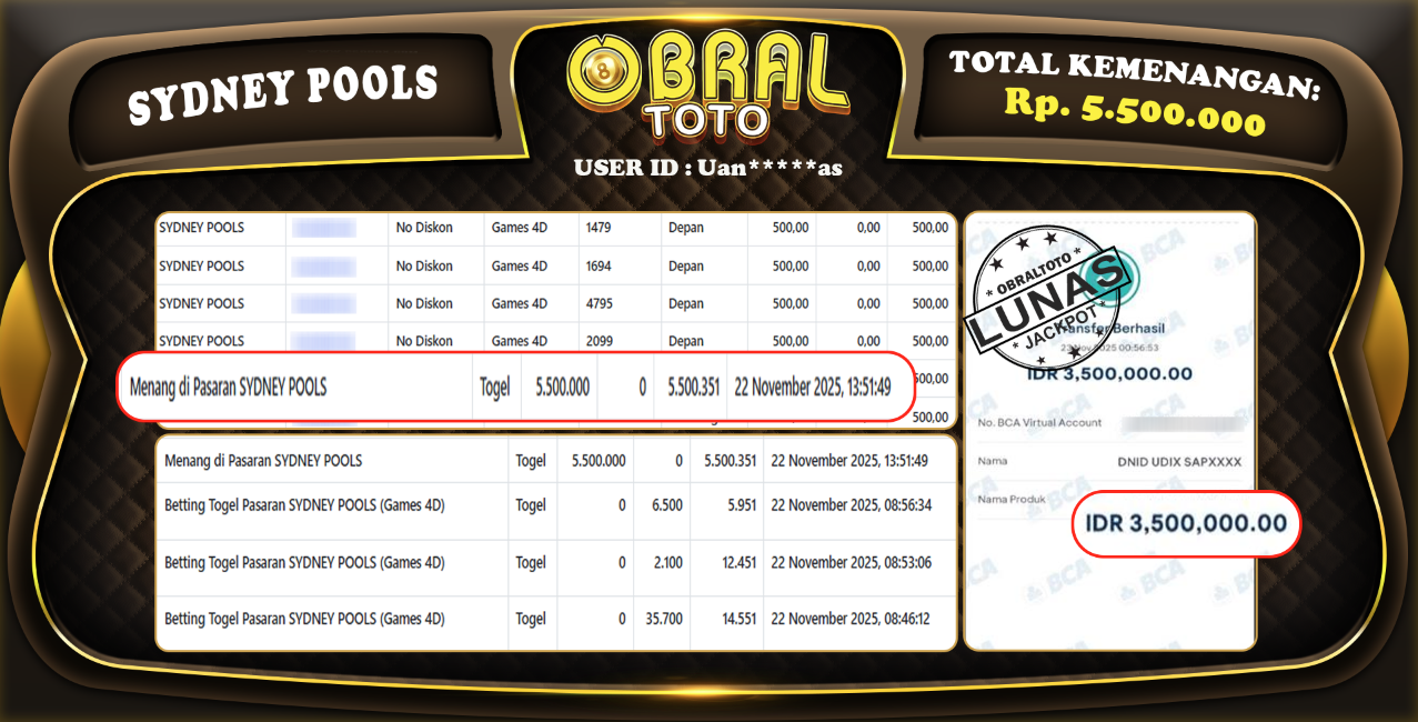 Kami merayakan selamat kepada salah satu pemain setia situs OBRALTOTO yang berhasil meraih kemenangan besar senilai Rp,5.500.000 dalam permainan SYDNEY POOLS pada tanggal 23 November 2025. Kemenangan ini telah kami proses dan pemahaman secara LUNAS ke rekening yang terdaftar. Semoga kemenangan ini menjadi motivasi bagi pemain lainnya untuk terus mencoba keberuntungan dan menikmati permainan di OBRALTOTO .