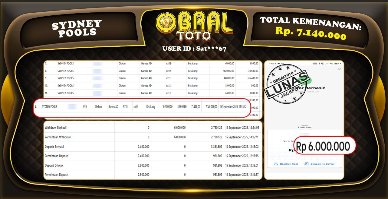 Kami merayakan selamat kepada salah satu pemain setia situs OBRALTOTO yang berhasil meraih kemenangan besar senilai Rp,7.140.000 dalam permainan SYDNEY POOLS pada tanggal 15 September 2025. Kemenangan ini telah kami proses dan pemahaman secara LUNAS ke rekening yang terdaftar. Semoga kemenangan ini menjadi motivasi bagi pemain lainnya untuk terus mencoba keberuntungan dan menikmati permainan di OBRALTOTO .