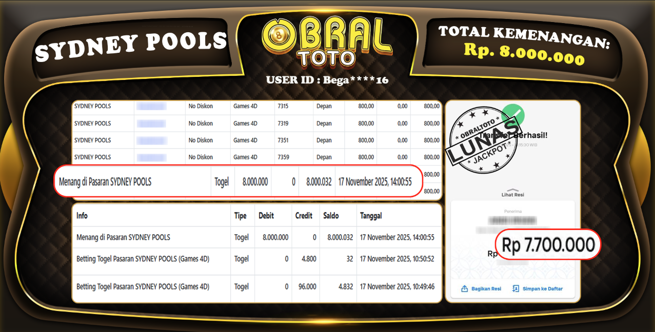 Kami merayakan selamat kepada salah satu pemain setia situs OBRALTOTO yang berhasil meraih kemenangan besar senilai Rp,8.000.000 dalam permainan SYDNEY POOLS pada tanggal 18 November 2025. Kemenangan ini telah kami proses dan pemahaman secara LUNAS ke rekening yang terdaftar. Semoga kemenangan ini menjadi motivasi bagi pemain lainnya untuk terus mencoba keberuntungan dan menikmati permainan di OBRALTOTO .